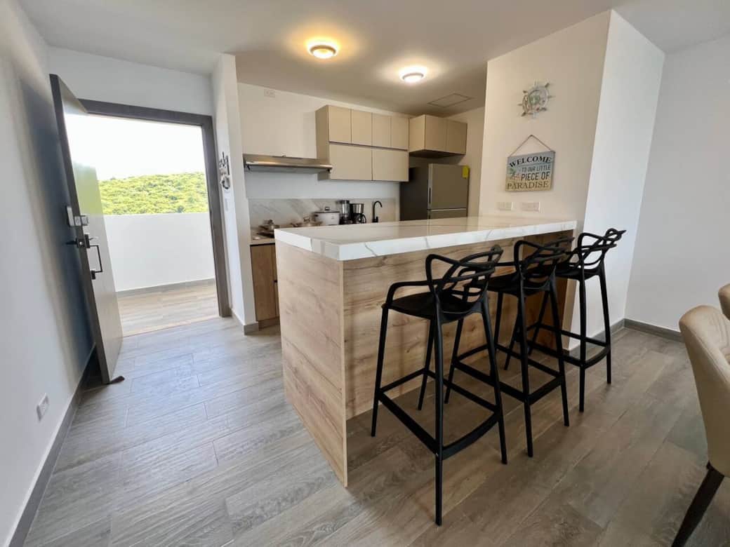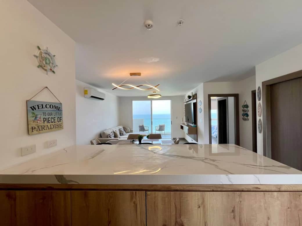 The apartment features two bedrooms (one with a queen bed and the other with two bunk beds), two full bathrooms, a cozy L-shaped sofa, Smart TVs, a dining area for six, and a granite breakfast bar. The kitchen is fully equipped with appliances and utensils, plus a washer and air conditioning in every room. From the private balcony, you can admire the most beautiful sunsets over the Pacific Ocean.